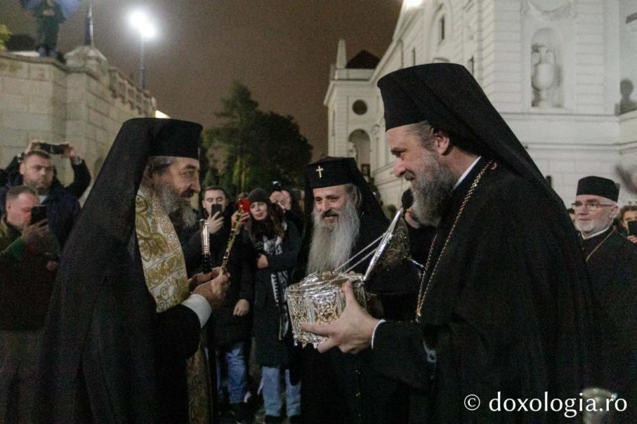 Înaltpreasfinția voastră, vă mulțumim că împreună cu părinții însoțitori, ne-ați invitat pentru a ne afla în aceste zile în eparhia Înaltpreasfinției voastre. Invitația pe care ne-ați adresat-o este o dovadă a iubirii în Hristos pe care o au Bisericile surori între ele, în numele lui Hristos. Vă mulțumim pentru că ne oferiți binecuvântarea și prilejul să ne închinăm la moaștele Sfintei Parascheva și să devenim și noi participanți la această mare minune a pelerinajului Sfintei, dimpreună cu toți închinătorii și pelerinii care vin să se închine la această sărbătoare. Este o imagine emoționantă, izbitoare, imaginea pe care am avut-o venind și intrând în sfântul locaș, văzând rândul de pelerini, să vedem, așadar, mulțime multă de popor, de credincioși care așteaptă în timpul nopții și în condiții climatice nu tocmai potrivite pentru multe ore, pentru a se închina la moaștele Sfintei Parascheva. Aceasta dovedește credința poporului dreptcredincios care se îndreaptă cu spre sfinți, cerând să primească har dumnezeiesc de la ei, cei care sunt casnicii și prietenii lui Dumnezeu. Ne bucurăm, de asemenea, că ne-ați oferit prilejul să se afle aici pentru prima dată o părticică din moaștele Sfântului Grigorie Palama. Este împreună ocrotitor al cetății Tesalonicului, împreună cu Sfântul Mare Mucenic Dimitrie. Este prima dată în istoria Bisericii și în istoria Bisericii din Tesalonic și a Sfântului Grigorie Palama când iese din Tesalonic și vine să binecuvinteze Biserica locală de aici, din Iași.